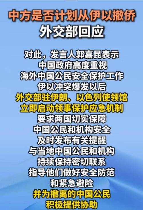 鉴于冲突扩大化的风险,中国外交部已经开始撤离,在伊朗和以色列的中国公民,外交部在6月17日的记者会上,呼吁在这两国的公民,立即联系当地的使领馆。接下来中东局势如何演变,我们静观其变。