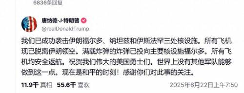 据央视新闻援引美媒消息,美国总统特朗普宣布,已经对伊朗福尔多、纳坦兹和伊斯法罕这三处核设施发动“成功打击”,目前所有参与空袭的战机均已撤离伊朗领空。据悉,美军的主要目标是深藏地下的福尔多核设施,特朗普称,美军飞机对其投掷了“满载炸弹”。