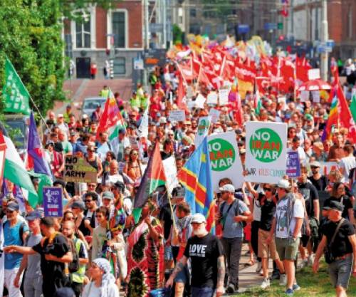22日,有近万名民众走上街头抗议北约峰会和增加军费开支。这些示威者,既有当地的民众,也有特意从其他欧洲国家赶来参加抗议的民众。