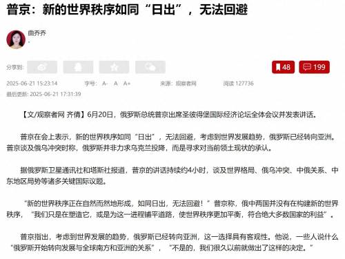 首先,自从俄乌冲突爆发以来,西方就不断试图孤立俄罗斯,并打造所谓俄罗斯走向衰亡的叙事,如今普京霸气为俄罗斯正名,既是对西方的有力反击,也展示出俄罗斯的战略转向以及对新型国际关系的探索。