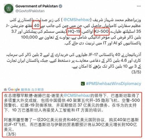 而且前段时间,巴基斯坦官方账号突然发布了一则重磅信息,称购买了40架中国歼35战机,数量不明的KJ-500预警机和中国某型防空导弹防空导弹。