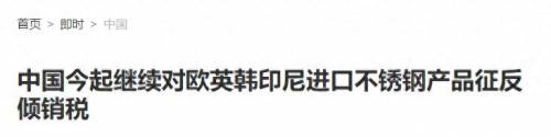 据商务部官网发布的消息,中方将从7月1日起,继续对欧盟、英国、韩国和印尼进口的不锈钢产品征收为期五年的反倾销税。