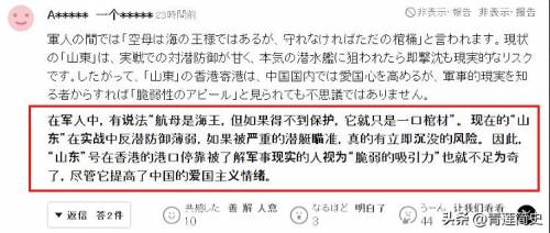 最后一个日本网民进行总结式的评论:“目前山东舰在反潜能力上太弱,一般的潜艇就能够将它击沉。山东舰停靠香港,在中国国内可能激发爱国心,但对了解军事现实的人来说,将中方此举称之为展示脆弱也不为过。”