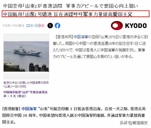 山东舰编队入港那天,日本共同社派出记者到了现场。记者回国后写了一篇文章,分别用英文和日文进行刊载。英文版的文章标题为《中国首艘新型航母山东舰访问香港》,日文版的文章标题为《中国海军航母“山东”号访问香港,中国旨在通过炫耀武力来激发港人的爱国主义情怀》,仅仅从标题上看就知道这是一篇夹带私货的文章。