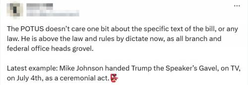 “总统根本不关心法案的具体内容,也不在乎任何法律。他现在凌驾于法律和规则之上,所有部门和联邦部门的负责人都对他唯命是从。这就是一个最新例子。”