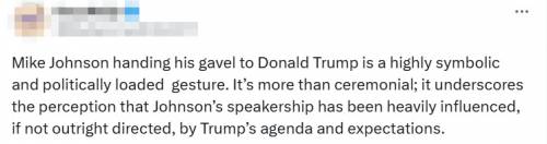 “约翰逊将议事槌交予特朗普,这一姿态极具象征意义,且饱含政治深意。它远非单纯的仪式性举动,更凸显出一种普遍认知:约翰逊的议长职权即便未被特朗普的议程与诉求直接操控,也深受其左右。”