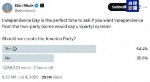 实际上在前一天特朗普在法案上签上自己的大名前几个小时,马斯克就在社交平台上发起“建立新党派”的投票,询问网友是否支持建立第三党——美国党。
