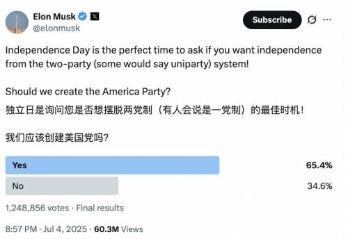 6月5日,马斯克首次提出建立“美国党”的设想。而在7月4日就发布了一次投票。他说如果投票的比例超过2:1,那么美国党就会成立。