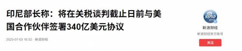 7月5日,印尼经济统筹部长艾尔朗加·哈尔塔托宣布,印尼即将与美国签署一份总额达340亿美元的贸易协议。