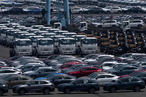 2025年7月7日,日本横滨,港口停放着等待装运的本田汽车和五十铃卡车。 视觉中国