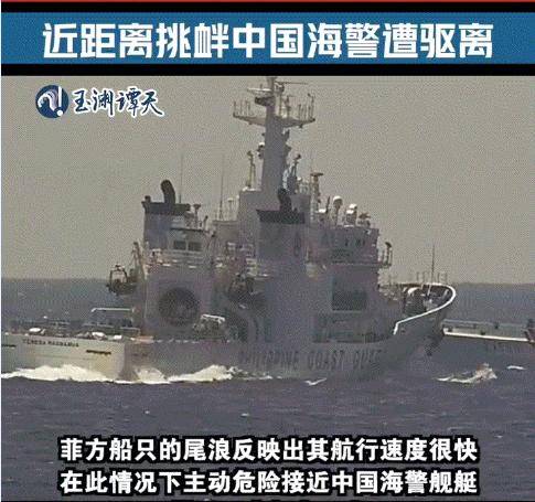 此外,菲律宾该舰还3次高速从我国巡逻艇的船尾位置穿过,掀起的浪头,打得巡逻艇左右摇摆。这个场景看上去就像菲律宾海警船企图仗着船大动力强,想把中国海警船当场掀翻甚至是撞毁的意图。这实际上已经严重威胁了中方船只和船上人员的安全。