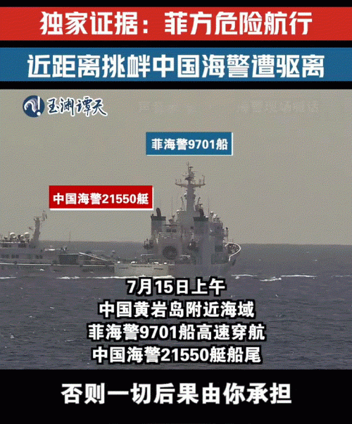 没想到“仲裁事件”才过去没两天,菲律宾又在南海搞事。来自“玉渊谭天”的消息,7月15日,在黄岩岛附近海域,菲律宾海警最大的9701号舰(排水量2600吨)对我国2艘百吨级海警船发起了数次非常危险激进的挑衅行动。菲律宾的海警船仗着吨位大,直接高速撞向我们的巡逻艇,然后又紧急刹车,双方最近距离不到百米。