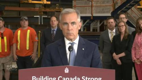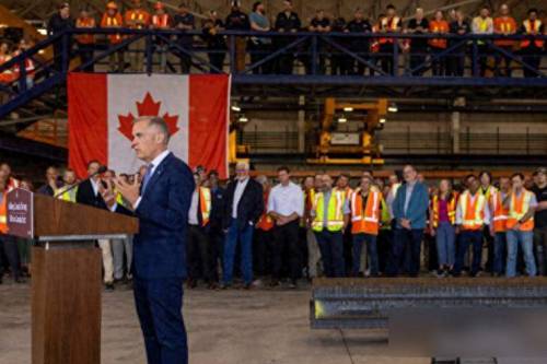 当地时间7月16日,卡尼在汉密尔顿市一钢铁厂讲话。加媒视频截图
