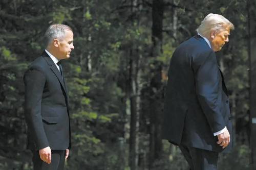 图为6月七国集团峰会在加拿大举行时,加总理卡尼迎接美国总统特朗普的画面。(视觉中国)
