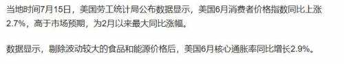 美国劳工部的数据显示,6月份,美国消费者价格指数同比上涨2.7%,高于市场预期,是2月份以来最大同比涨幅。剔除波动较大的视频和能源价格后,美国6月核心通胀率同比增长2.9%。