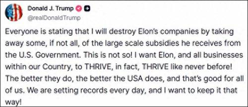 “所有人都在说,我要取消埃隆(马斯克)从美国政府获得的部分(如果不是全部)巨额补贴,从而摧毁他的公司。才不是呢!”特朗普写道,“事实上,我想要埃隆和我们国家所有的企业都能蓬勃发展,前所未有地蓬勃发展!”