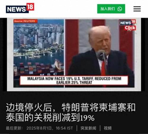 8月1日,美国给全球各国制定了新的关税税率,公布的柬埔寨和泰国的税率从36%降到了19%。
