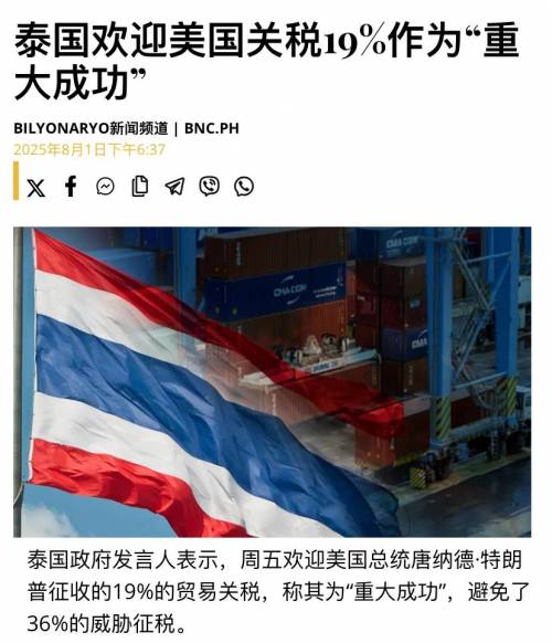 比如泰国政府发言人说,对特朗普给泰国制定19%的关税表示欢迎,称这是一个巨大的成功。