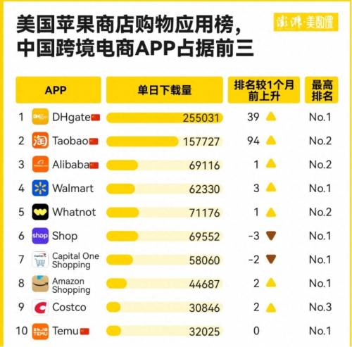 敦煌网在美国的下载量从 300 多名飙升至榜首,淘宝、希音也冲进前三。