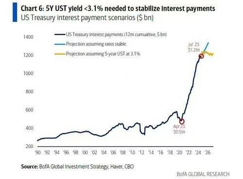 4. 第二个,美国要重新开始QE量化宽松了,但可能会改叫YCC,收益率曲线控制,也就是日本的老路。原因是美国国债利息爆了,1.2万亿美元一年,收益率在4%-5%这没法玩,低息的还掉变高息,一会利息就变2万亿美元一年了。日本那就是央行来搞YCC,压低利息,让政府国债利息不要爆。图二,美国肯定需要搞YCC了,如果成功把国债利率降到3%,那利息就能稳一阵子,1.2万亿美元暂时不增加了。但YCC的动作,就是要QE,美联储来买国债。迟早的事了。
