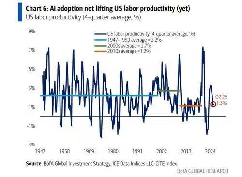 3. 第一个,美国押宝人工智能,已经是“大到不能倒”的程度了,英伟达不能出事了。如果AI泡沫破灭,美国经济就肯定完了,美股会稀里哗啦。这事最终标准是,AI能不能提升美国的劳动生产率。图一,美国劳动生产率,2000年代互联网是有提升的,平均2.7%明显高于之前。而现在AI还没啥大用,2025年二季度还只是1.3%,没啥动静。说不好会如何,也许以后能高。但现在是按2000年代的互联网来安排的,各大公司先把AI基础设施的支出弄到极高,英伟达变成4.4万亿美元的市值第一。这个确实说不好,正方反方都有。但中国是两手准备的,AI泡沫破了就赢了,如果有戏我们也在大搞,赢得至少是第二大。