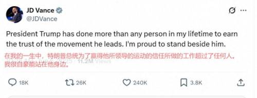 据路透社报导,特朗普之前曾表示万斯“非常有能力”,但却一直回避讨论有关美国总统“接班人”角色。