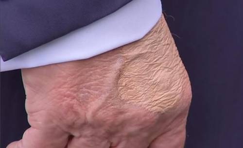 摄像机捕捉到的画面显示,特朗普手背出现淤青,涂抹了遮瑕膏以掩饰