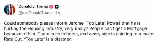 他在社交平台上写到:“谁能告诉‘太迟先生’杰罗姆·鲍威尔,他正在严重伤害房地产行业?因为他,人们无法获得抵押贷款。”