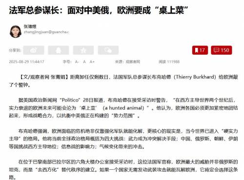 而且就在启动调查的同时,这边作为法国总参谋长的布克哈德更是表示,当下的欧盟要团结起来,不然就要成为中美俄的桌上的菜了。