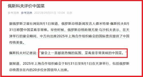 乌沙科夫表示中国向他们提供了非常美味的食品,佩斯科夫说宴会上中国很热情,菜肴也很美味。