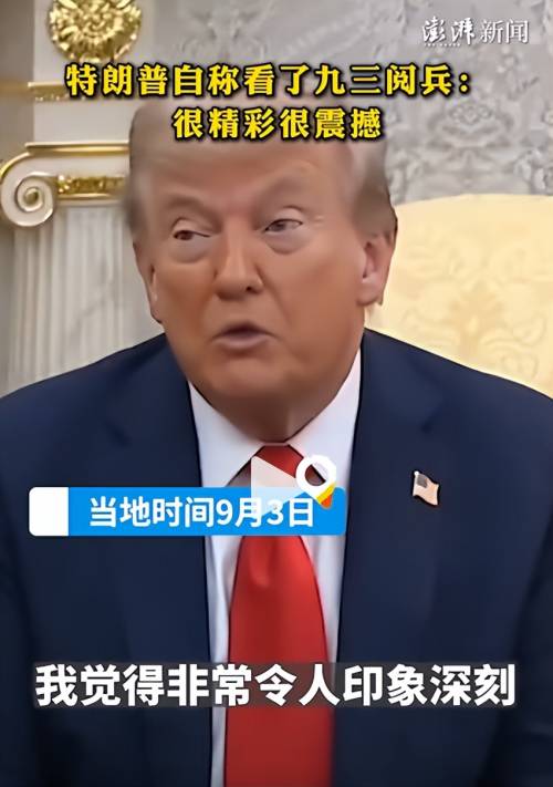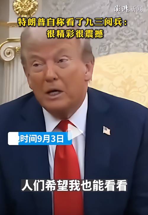 据澎湃新闻报道,当地时间9月3日,特朗普在白宫向记者透露,自己看了中国胜利日大阅兵,他形容阅兵仪式非常精彩和震撼。他说:“别人希望我看一看,我确实看了。”
