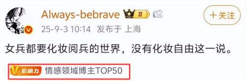 然而,该博主作为公众人物,不仅不发表正面思想,反倒带头诋毁国家阅兵仪式,甚至还说“女兵都要化妆阅兵,这世界没有化妆自由一说”。