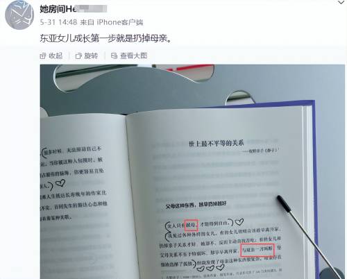 她在帖子中提出,东亚女儿成长的第一步就是要扔掉母亲,甚至还很赞同“弑母”、“与双亲一刀两断”等过激言论。