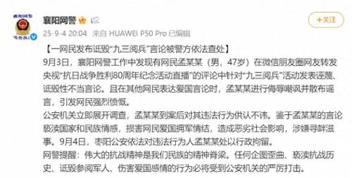 9月3日,阅兵仪式当天,襄阳一47岁姓孟的男子,在微信朋友圈内发布不当内容,公然诋毁、嘲讽侮辱阅兵仪式。