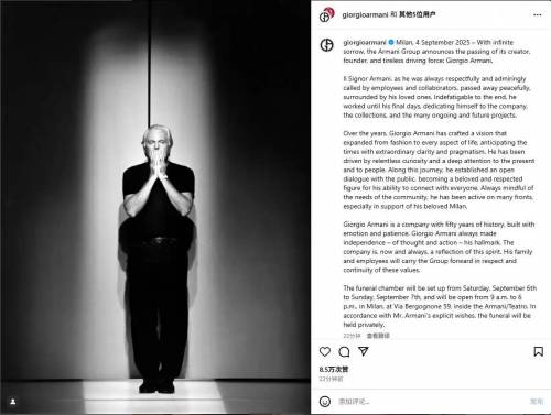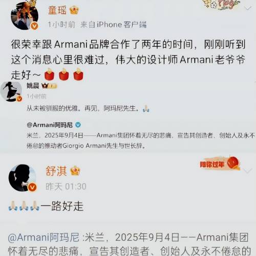 也正因此,阿玛尼的离世,即便是在国内娱乐圈,也引起不小风浪,大量明星艺人撰写小作文,悼念阿玛尼的离世。