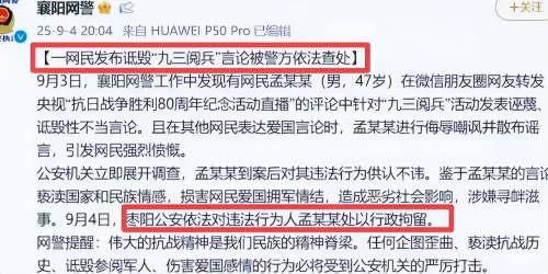阅兵第二天,孟某某被当地网警直接行政拘留处理。