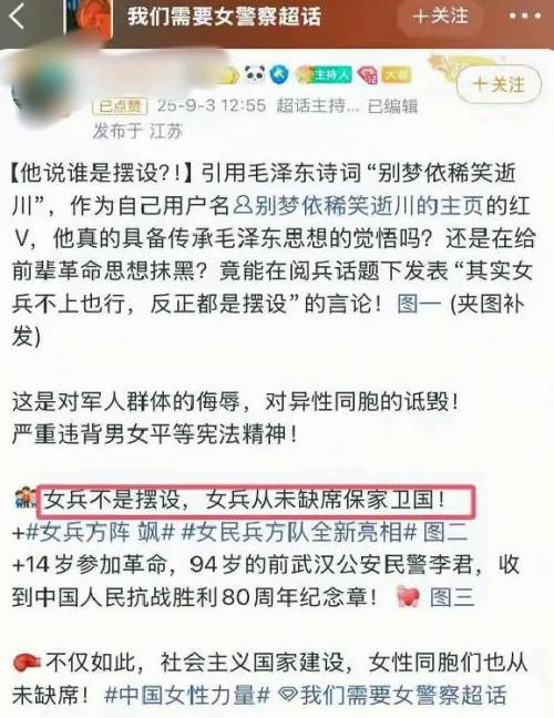 能在阅兵正在进行的时候,说出“女兵是摆设”,关键是这人的微博名,相当正能量。