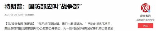 当地时间9月5日,特朗普竟然把“美国国防部”(Department of Defense)正式更名为“美国战争部”(Department of War),连官方标志都给改了。