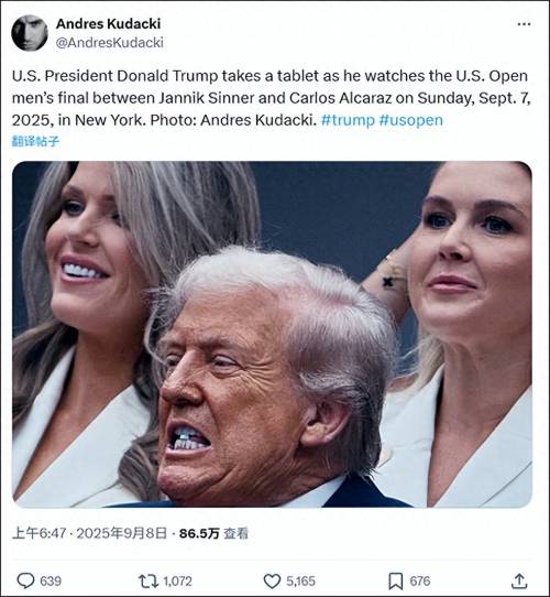 当地时间9月7日,特朗普现身纽约阿瑟·阿什体育场观看美国网球公开赛男单决赛,期间库达基拍下了一张照片,当时特朗普似乎正在咬服某种蓝色小药片。