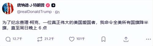 在柯克出事后,特朗普在自己的社交媒体上发送了多条推文,表达对事件的惋惜以及对柯克的遗憾。