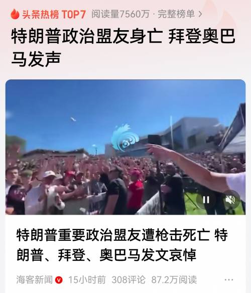 现任总统的一个政治盟友被枪击身亡,震惊了美国!特朗普不仅下令降半旗哀悼,而且专门为之发布全国电视讲话,民主党人前总统奥巴马等也发声谴责凶手。表面看共和党与民主党意见罕见地一致,事实上,美国撕裂更加严重,一些人陷入恐慌之中。