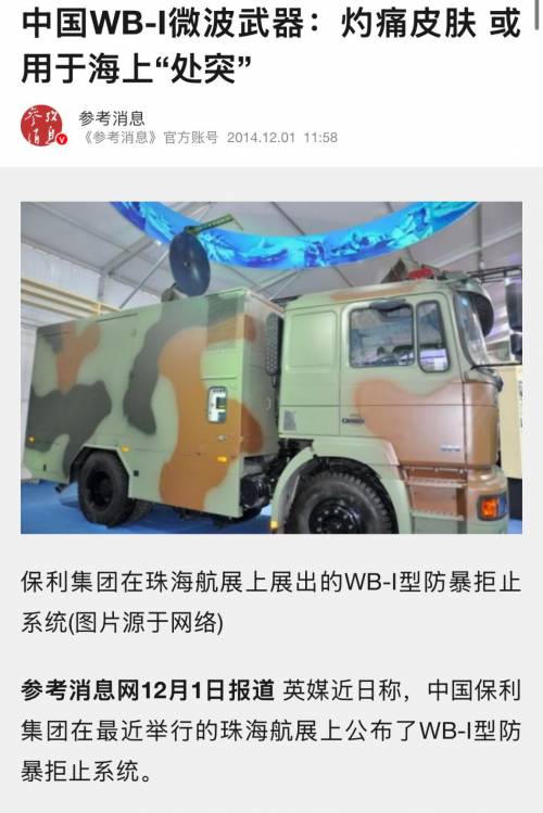而另一种攻击方式,就跟微波一模一样了:当高功率微波照射到人体时,人体内的水分子会迅速升温。这会导致皮肤灼伤、内部组织受损。非致命的某新型高科技武器,比如一些“拒止武器”,就是利用这种热效应,让被照射者感到剧烈灼热和疼痛,从而迅速撤离,达到驱散人群的目的。早在2014年的珠海航展上,我国军工外贸企业暴力集团就展出了WB-I型微波防暴拒止系统,这类装备由于其非致命性和可控的攻击范围,通常作为警用防暴用途而非军用。