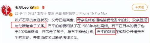 据大V爆料称,石平在国内还有一个妹妹,但妹妹曾公开谴责他的言论,并申请断绝法律关系,而石平在日本的妻子也于2020年与他离婚,并带走了孩子。