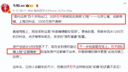 北京朝阳的公寓、成都的两套商铺、上海静安的日料店,产权登记页上“石平”两个字清清楚楚,算下来总资产足足有3500万,这反转来的实在猝不及防。