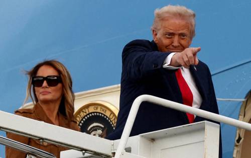 特朗普和第一夫人梅拉尼娅·特朗普登上空军一号时做出手势
