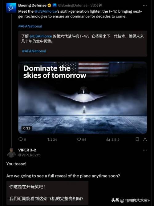 波音防务更是急眼了,直接发了一个会动的ppT,时长高达30秒左右,经过小编戴上眼镜反复确认发现F 47上面的美国旗乱晃,以及F 47后面的烟雾乱动,最显眼的则是第六代战机F 47,他将带来下一代技术,确保未来几十年领先,这一串大字格外的亮眼