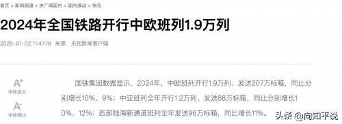 接下来引用一个十分权威的数据,根据2025年年初国铁公布的数据,整个2024年中欧班列一共发车了1.9万列。