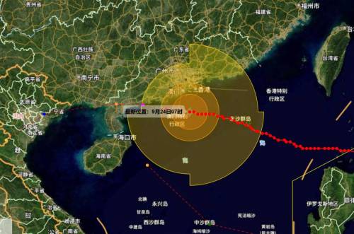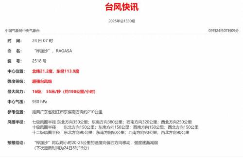 今年第18号台风“桦加沙”(超强台风级)的中心今天(24日)早晨5点钟位于广东省阳江市东偏南方向约255公里的南海北部海面上,就是北纬21.1度、东经114.3度,中心附近最大风力有16级(55米/秒),中心最低气压为930百帕,七级风圈半径250-380公里,十级风圈半径150公里,十二级风圈半径90公里。
