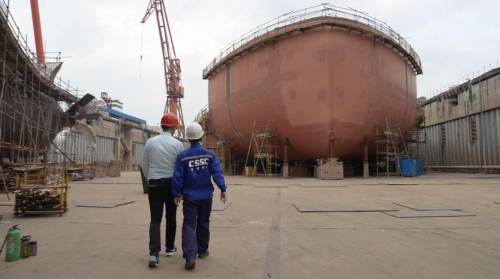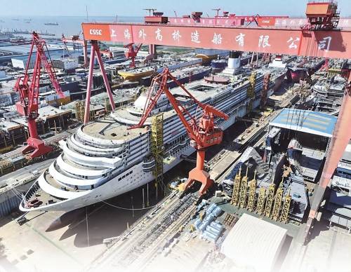 刚出坞的9000车汽车运输船正等着刷最后一遍漆。不远处,中国第二艘大型邮轮 “爱达花城” 号的甲板上,工人正调试舷窗。