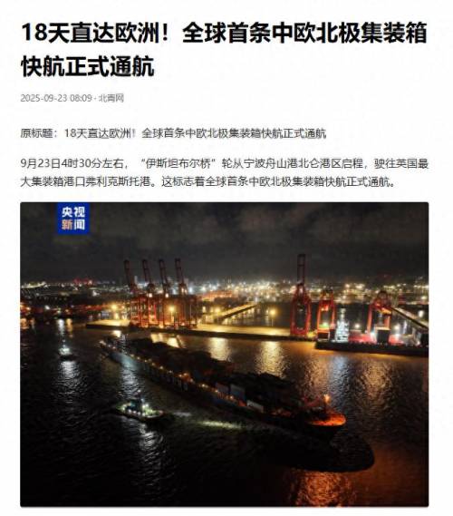 2025年9月23日凌晨4点30分,“伊斯坦布尔桥”轮从宁波舟山港启航,正式开通全球首条中欧北极集装箱快航。